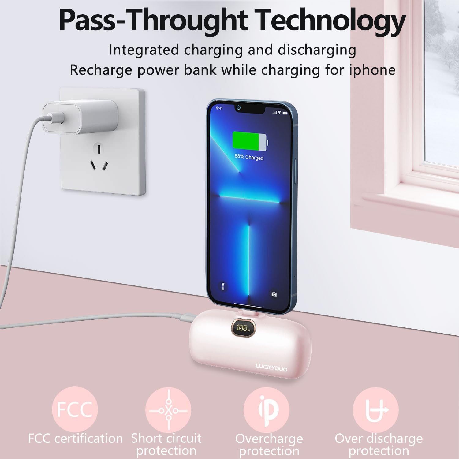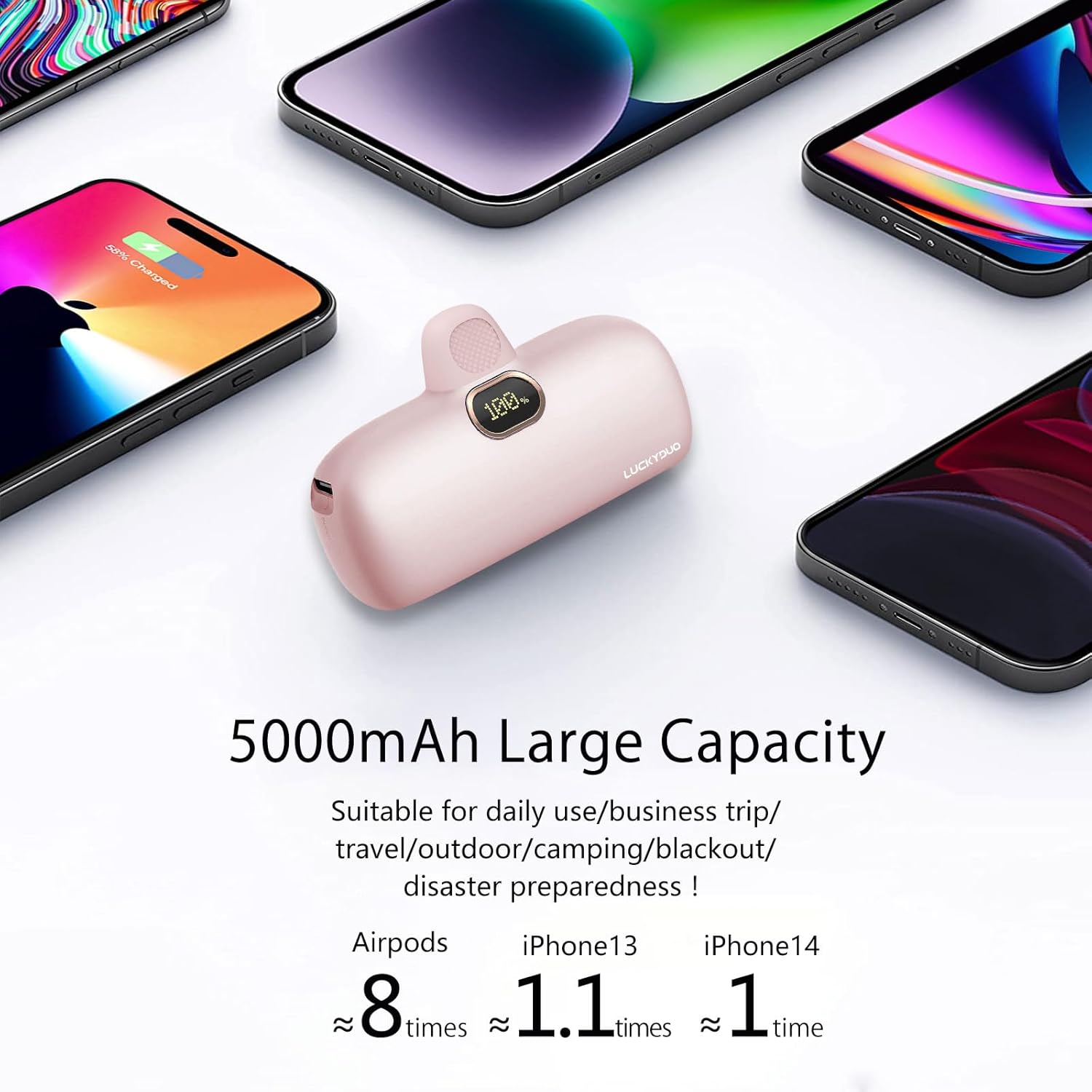 LUCKYDUO Portable Charger 5000mAh, Compact Power Bank Compact Battery Pack with Fast Charging and PD Input, Featuring LED Display Compatible with iPhone 14/14 Pro Pro Max/13/13 Pro Max/12/12 Pro/11/X/8/7(PINK)